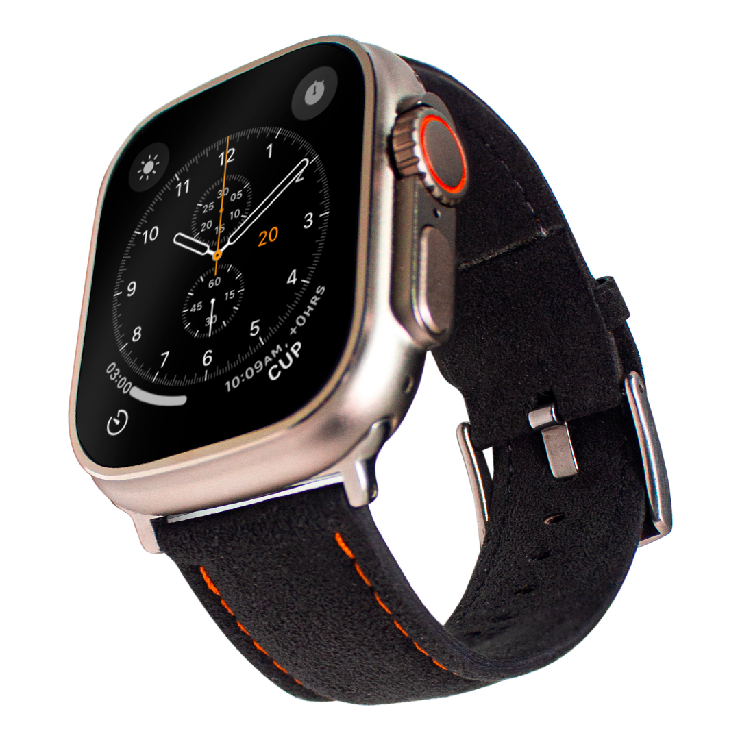 1 Pulseira de relógio em tecido Alcantara - 24mm largura | Preto e costura Tracejada Laranja.